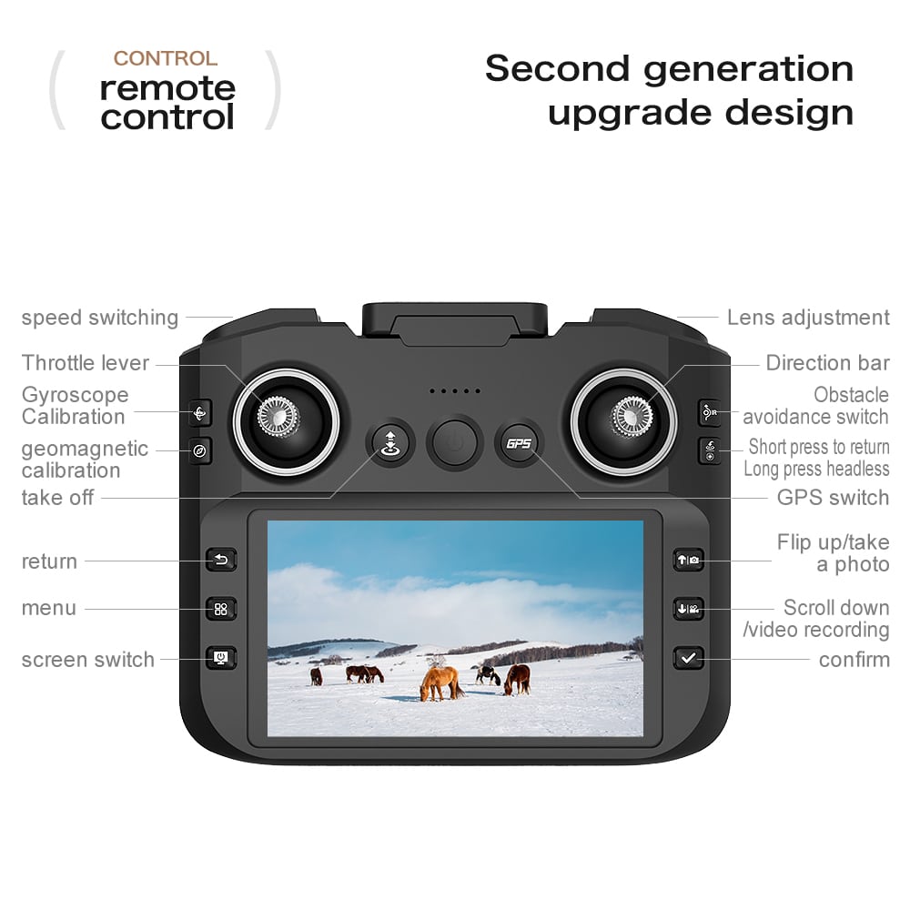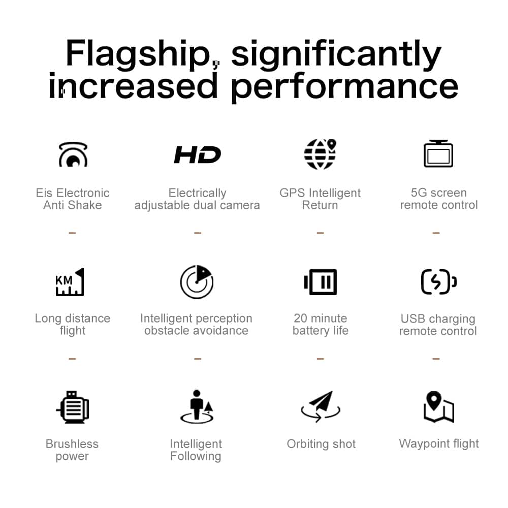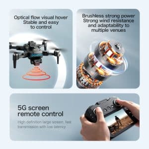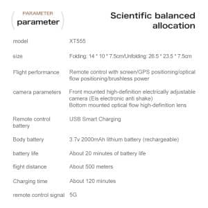 Deze middelgrote opvouwbare drone integreert 5G- en wifi-transmissie voor professionele luchtfotografie. Hij beschikt over een dubbel camerasysteem met een groothoeklens aan de voorkant en een optische flowcamera aan de onderkant voor nauwkeurige positionering, beide gestabiliseerd door een servo-gimbal en EIS. De afstandsbediening heeft een groot 4,3-inch display voor realtime HD-video. Met GPS maakt hij nauwkeurige terugkeerfuncties met één druk op de knop mogelijk. Een 2000 mAh-batterij zorgt voor een vliegtijd van ongeveer 20 minuten.